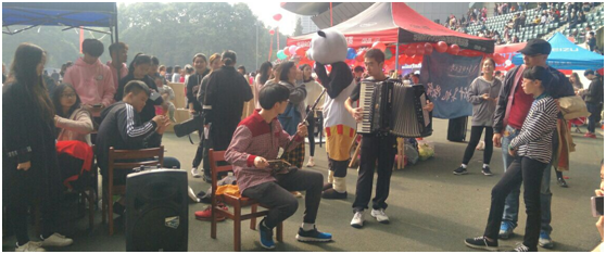 虽是在象征着体育拼搏的赛道上,但音乐学院的同学们仍是不忘本行,拿出了看家本领。在赛道旁表演起了手风琴二胡合奏曲《新赛马》、演唱了《易燃易爆炸》《多来A梦主题曲》等诸多广为人知朗朗上口的流行歌曲。人声鼎沸的体育场霎时也成了我院同学们展现自我,彰显青春魅力的舞台。