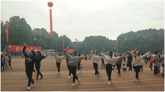 同样做为志愿者的还有16、17级舞蹈班的同学们。在音乐学院大本营旁,她们伴着激情欢快的音乐,用青春洋溢动感十足的舞蹈点燃了音院大本营的氛围。赢得了同学们热烈的掌声与尖叫声。用当采访到16级的梁馨予同学,问及对这样的志愿服务有什么感想时,她笑着说道:“这个舞蹈我们之前也有表演过,但为了这次校运会又重新的添砖加瓦排练了一段时间,大家都是积极参与,想来是对这次运动会极为重视和期待。感想嘛,大家最终跳的都很不错,我们音院是最棒的!”