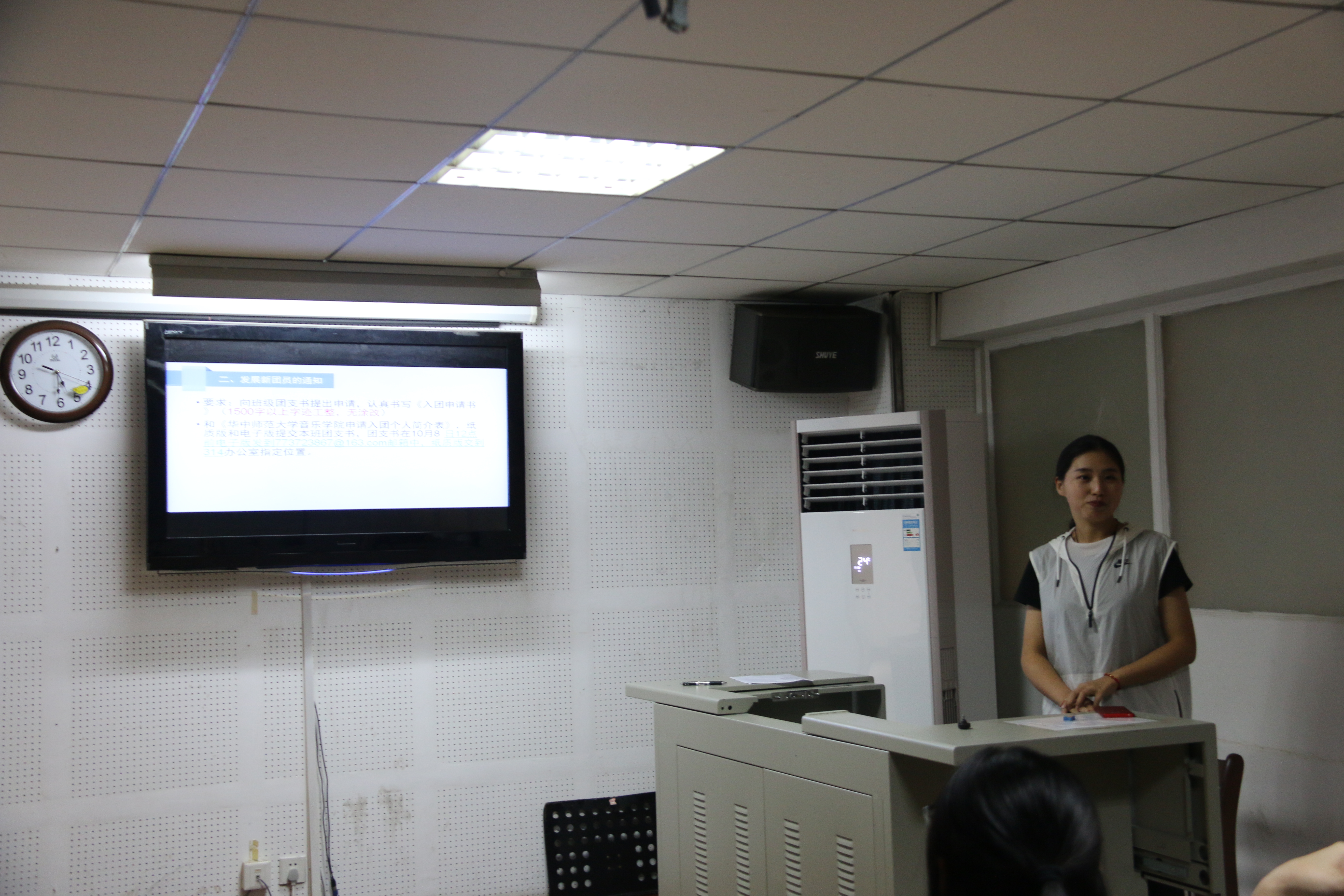 会议始初,团委学生会组织部部长张雨晴介绍会议重点。讲述到在我院即将开展的“百生讲坛”活动中,每个班需在9月21日之前推出一名同学代表本班参加院级“百生讲坛”演讲比赛。各个团支书需负责收集他们的个人信息及演讲稿并发至团委组织部部长邮箱并由组织部进行整理归纳。其二,团支书需查询落实各班同学入团情况,积极发展新团员,并确保每一位同学入团。其三,团支书收集的入党申请书时,需向同学们强调申请书书写规范。