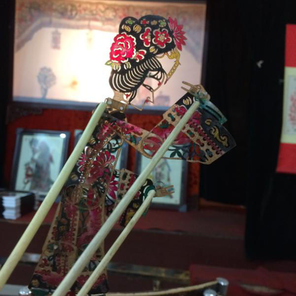 室内陈设简单,一台演出用的幕布,一张横式木桌,几把木椅,以及侧面一片手工皮影人物像。见我们走进来,幕布后老艺人探出头看了我们一眼,似有些疲惫地说了声:“就你们俩吧。你们先玩玩一旁的皮影儿,我准备准备,演出很快开始。”我们把玩了一会儿皮影儿,随后演出开始了……”