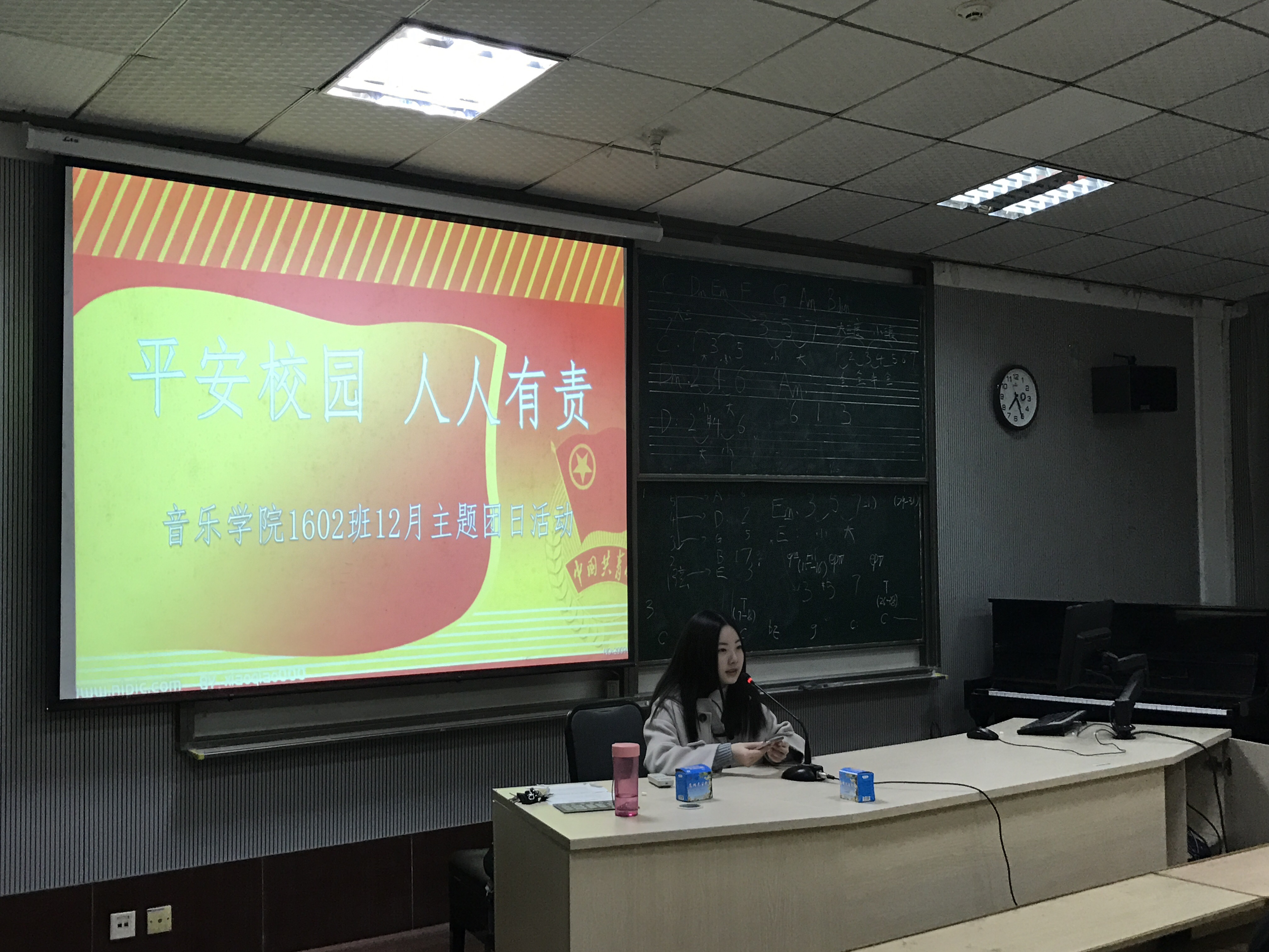 (通讯员:张艺丰)2016年12月18日下午五点,音乐学院1602班于华中师范大学音乐学院104教室开展了“平安校园 人人有责”为主题的团日活动,通过演讲、游戏等形式,让同学们充分了解到了安全的重要性,也增长了自己的安全意识。该活动由团支书奚佳玥和班长李韧杰主持,全体团支部成员都参与其中。