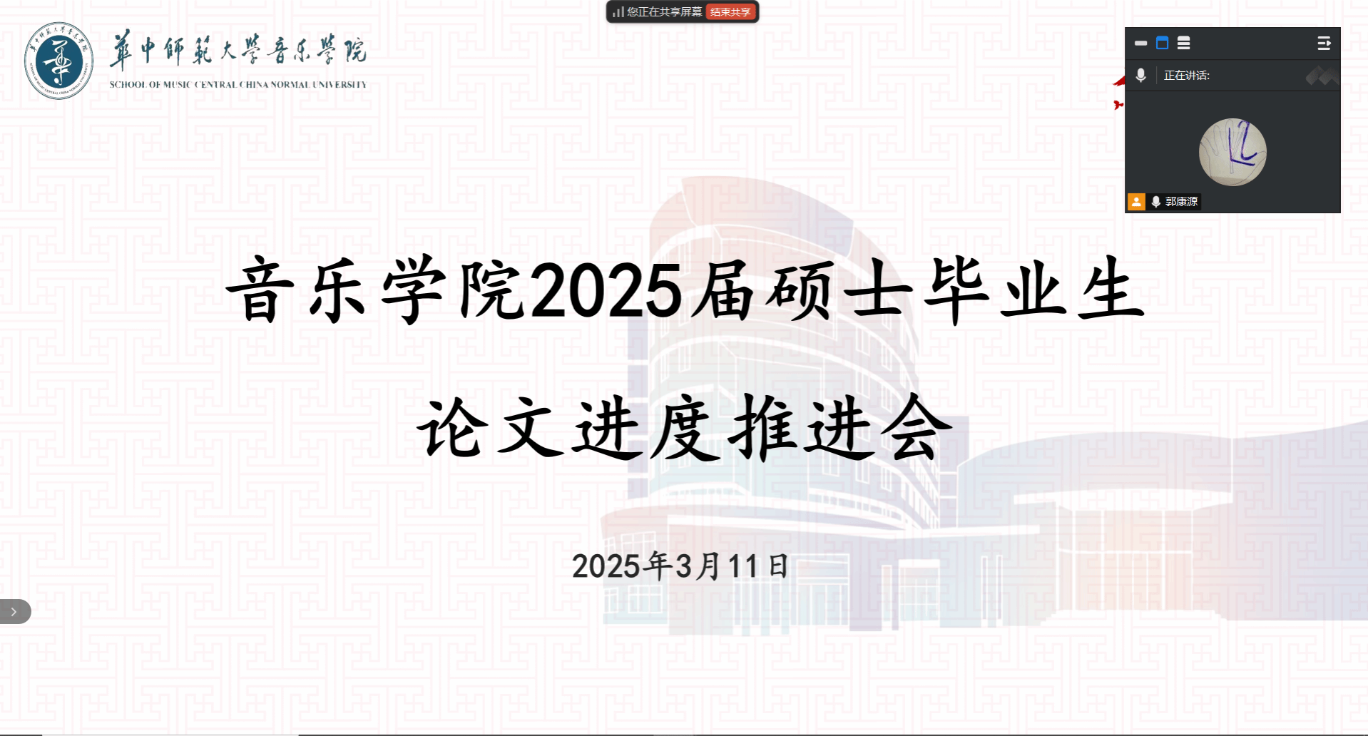 晚上18:30在线上开展2025届硕士毕业生学位论文专项推进会。会议邀请研究生教学秘书王瑾耀老师逐条解读《华中师范大学博士硕士学位论文盲评工作实施办法》,特别指出音乐类论文在格式规范、创新性论证等方面的常见问题。通过展示各类查重系统操作流程和降重技巧,提醒毕业生严守学术诚信底线。