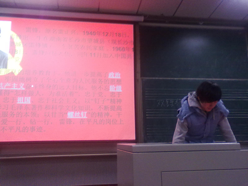 (通讯员 彭箐昱 摄影 杨雨霏)2012年3月11日晚6:00,华中师范大学音乐学院2009级党员才艺秀在晚点名时顺利展开。这次党员才艺秀是由2009级预备党员舞蹈专业的曹波同学主讲,院团委书记、09级辅导员许亨洪老师和09级全体学生参加。这次演讲内容的主题是《做一名优秀的当代大学生,实现人生价值——学习雷锋精神和大别山师魂精神》。