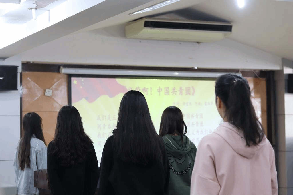 仪式第二项:全体起立,奏唱团歌。随着奋进的《中国共青团团歌》响起,“我们是五月的花海,用青春拥抱时代......”新团员们铿锵的歌声、坚定的眼神充分体现出他们加入中国共青团的决心、为团组织贡献力量的热情与爱国热忱。