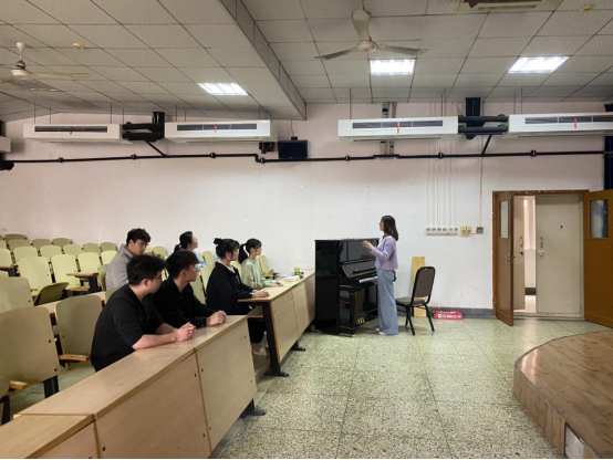 在美声演唱课程中,辛玥琪小导师通过带大家一起练声,指出共同的问题,再对每位学员进行一对一指导,个性化地帮助学员们提高演唱能力。当学员们出现卡嗓子等问题时,辛玥琪细心地教授解决方法,并以自己积极的情绪带动学员们勇敢地唱上去。