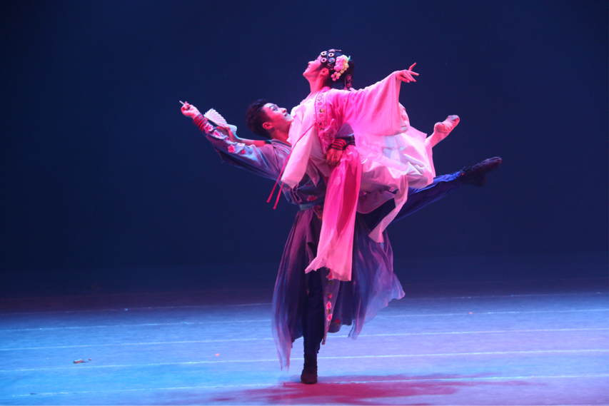 一柄桃扇,心有所属; 一身素衣, 终身不嫁。由兰天文、彭顺、邹艺娟编导,邹艺娟、康琦表演的双人舞《素衣桃花扇》。作品取自昆曲《桃花扇》的人物关系。在国家危亡之际,这对互许终生的有情人,男儿弃”小家”为“国家”,奔赴战场; 女子宁“出家”披“素衣”,誓死守节。抒生死离别之情,扬家国大爱之义。