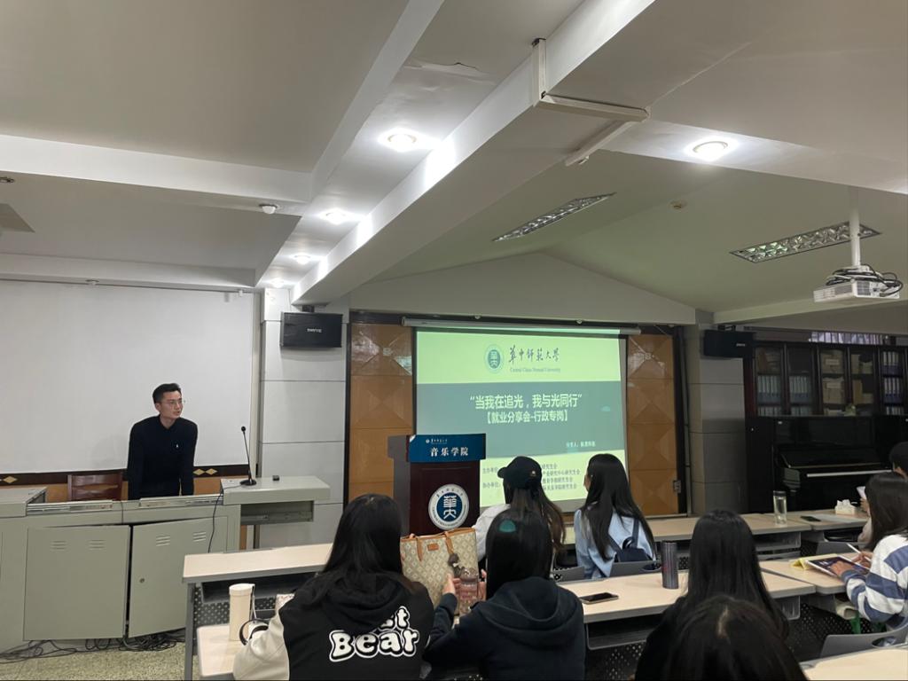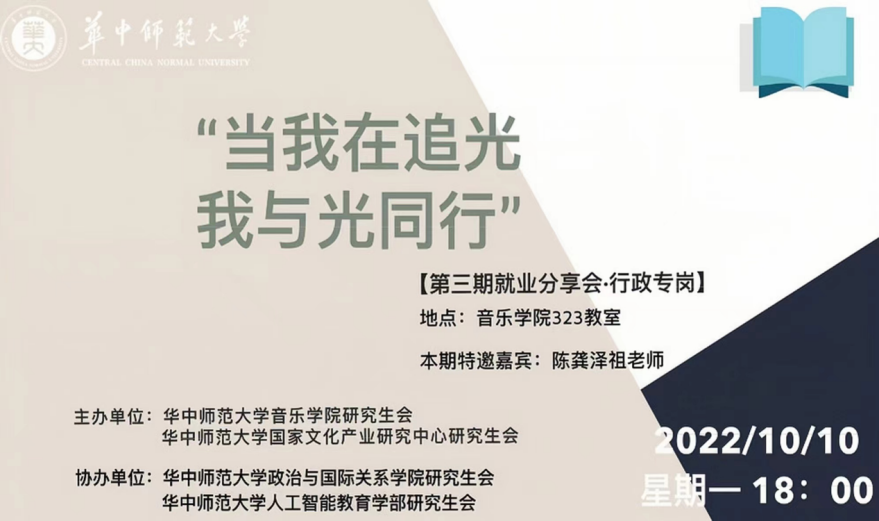 (通讯员 林俊 夏静)2022年10月10日下午6点,由音乐学院研究生会、国家文化产业研究中心研究生会主办,政治与国际关系学院研究生会、人工智能教育学部研究生会协办的“当我在追光,我与光同行”第三期行政专岗就业分享会在音乐学院323教室顺利举办。本次分享会邀请了华中师范大学音乐学院研究生辅导员陈龚泽祖老师为同学们做经验分享,来自各个学院的研究生积极参加本次会议。