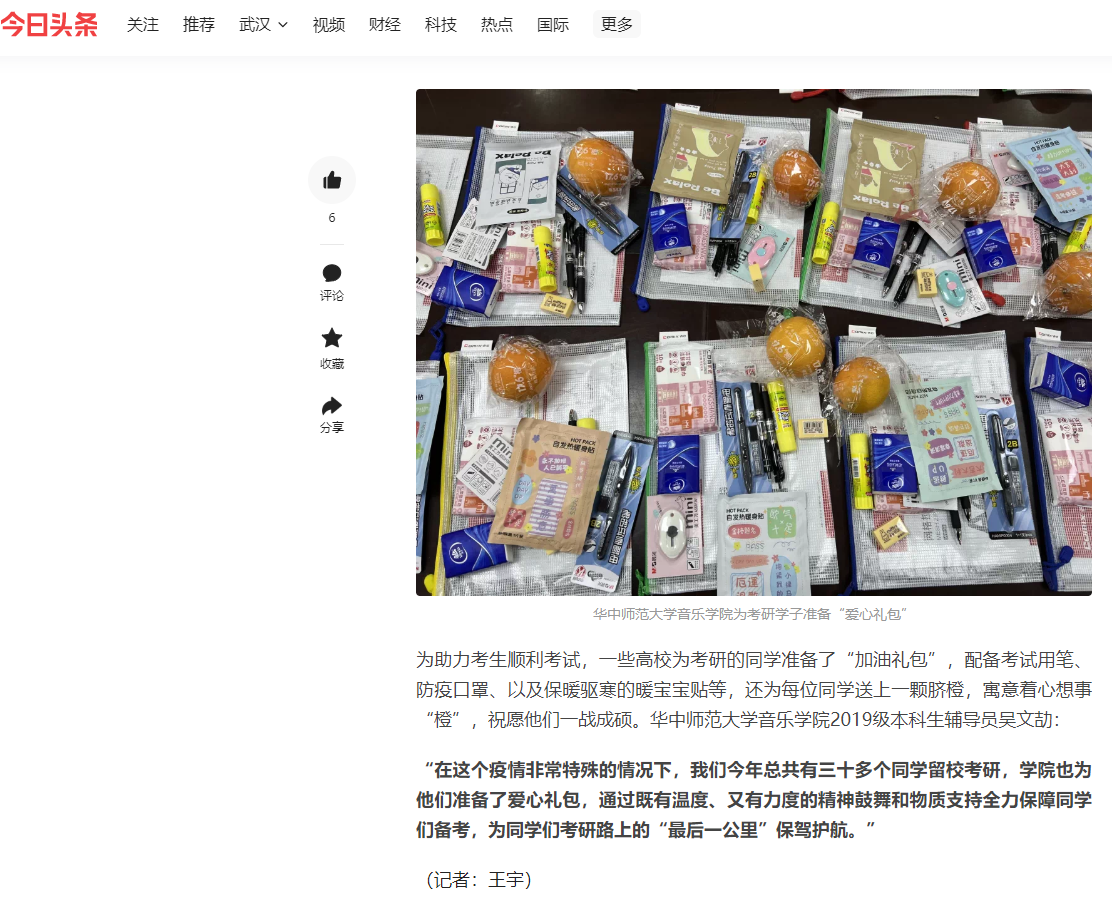 为助力考生顺利考试,一些高校为考研的同学准备了“加油礼包”,配备考试用笔、防疫口罩、以及保暖驱寒的暖宝宝贴等,还为每位同学送上一颗脐橙,寓意着心想事“橙”,祝愿他们一战成硕。华中师范大学音乐学院2019级本科生辅导员吴文劼: