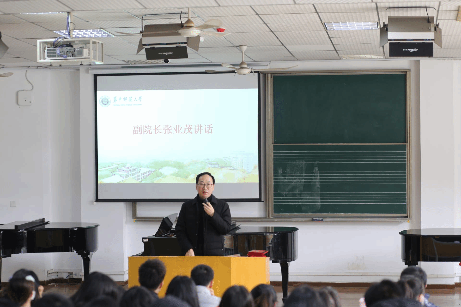 2月28日中午,2019级实习表彰大会在音乐学院427教室举行。音乐学院党委副书记陈晓刚、副院长张业茂、实习指导老师周年、陈艺文、常晓玲、张凝、邱耿华、杨沛霖等出席本次表彰大会,大会由谭述晔老师主持。大会开始前,谭述晔播放了一段实习回顾视频,视频中记录了各个实习小组从实习开始到结束的工作日常,展现了同学们丰富的实习生活。她提到,此次大会将表彰优秀实习个人,实习老师与实习小组,用总结迎接更好的开始。
