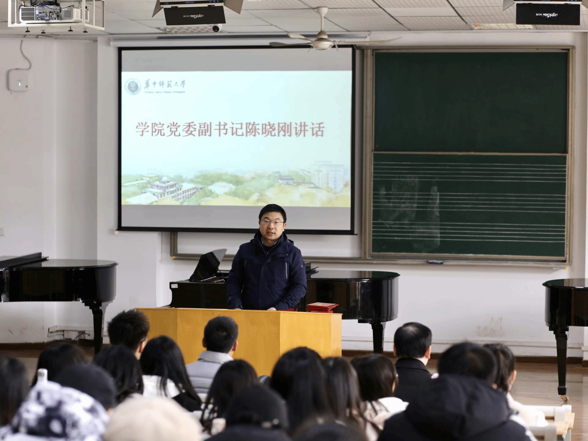 随后,由陈晓刚致辞。陈晓刚宣读优秀个人、优秀老师与优秀集体名单,并对这次实习做出了评价与总结。他提到,这次实习不仅是对学生教学能力的培养,更是对音乐学院教学能力的检验。陈晓刚对学院教学管理团队提供的保障与各位实习老师的指导表示感谢,同时对各位同学能够克服困难顺利完成实习任务表示祝贺。