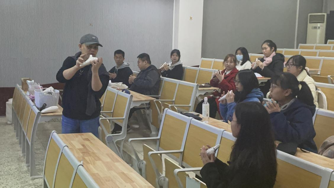 在第二个环节中,赵老师简单介绍了陶笛的起源和历史,告诉社员们陶笛最早起源于中国,但在国外得到发展,并讲述了一些自己在研究和探索陶笛更多可能性中的趣事。同时,赵老师也向同学们展示了各种形态各异的陶笛,有赵老师自己用药瓶、核桃做的小陶笛,也有赵老师和别人交换的“西瓜”陶笛,还有“花瓶”陶笛等等。这些形态各异的陶笛瞬间吸引了同学们的兴趣,赵老师在展示的同时也为同学们吹奏了很多悦耳动听的曲子,比如《千与千寻》等等。赵老师生动幽默的话语以及高超的演奏技术让现场气氛悄然升温。最后,赵老师回应社员们的问题,亲自教授了一些演奏陶笛的技巧,让社员们受益匪浅。