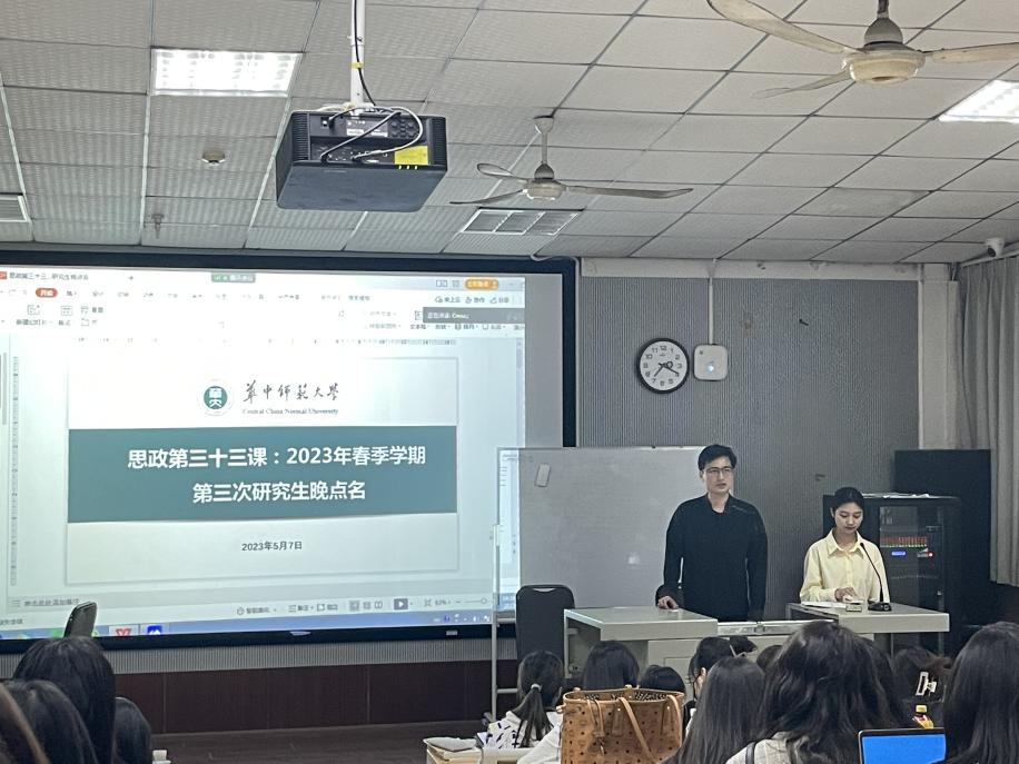 2023年5月7日晚,研究生2023年春季学期第三次点名于104教室举行,由研究生辅导员陈龚泽祖与兼职辅导员胡艺璇主持,音乐学院全体研究生参与。大会包括三项内容,分别是毕业生相关事项说明、研究生日常管理和近期重要事务安排。