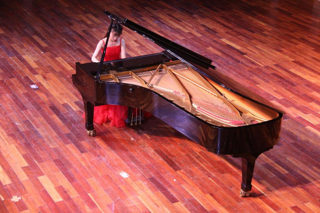 2014级音乐表演专业周依蓉演奏了一曲《新疆随想曲》,她身着红色礼服,与她所演奏出来的激昂热烈的音响效果交相呼应。《新疆随想曲》作于1978年,由“梦想-幻想-冥想-畅想-狂想”五部分组成“随想”。真实地还原了当地人民欢歌笑语的地域风情,通过周依蓉娴熟的技巧连接,听众仿佛踏上了新疆这片热情的土地。