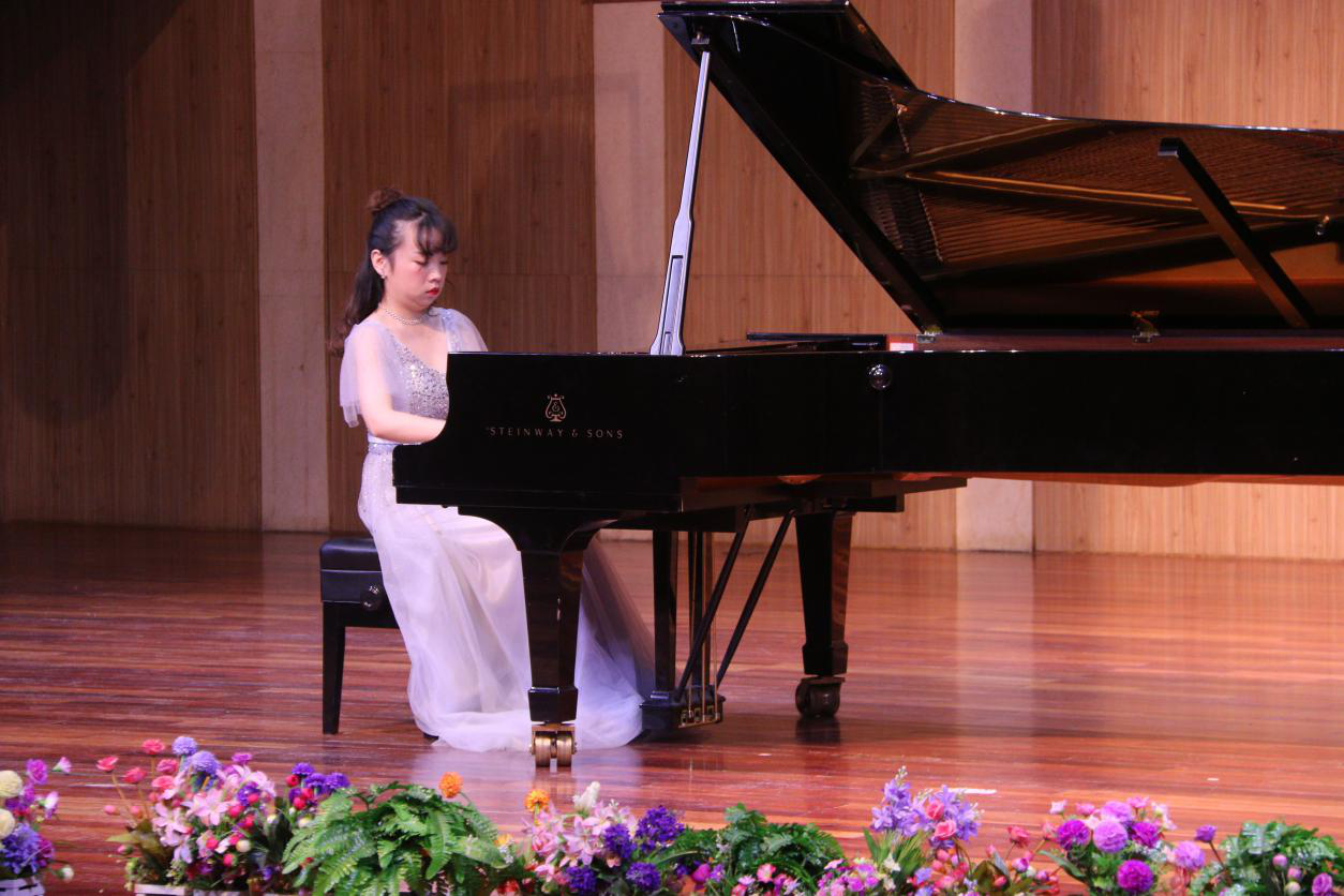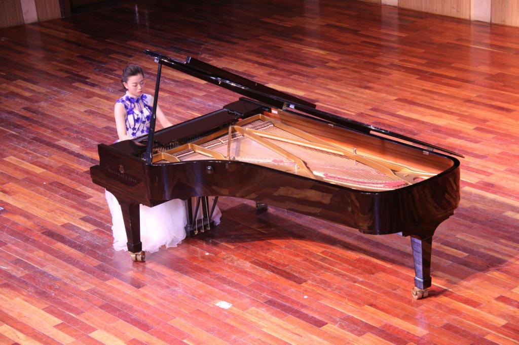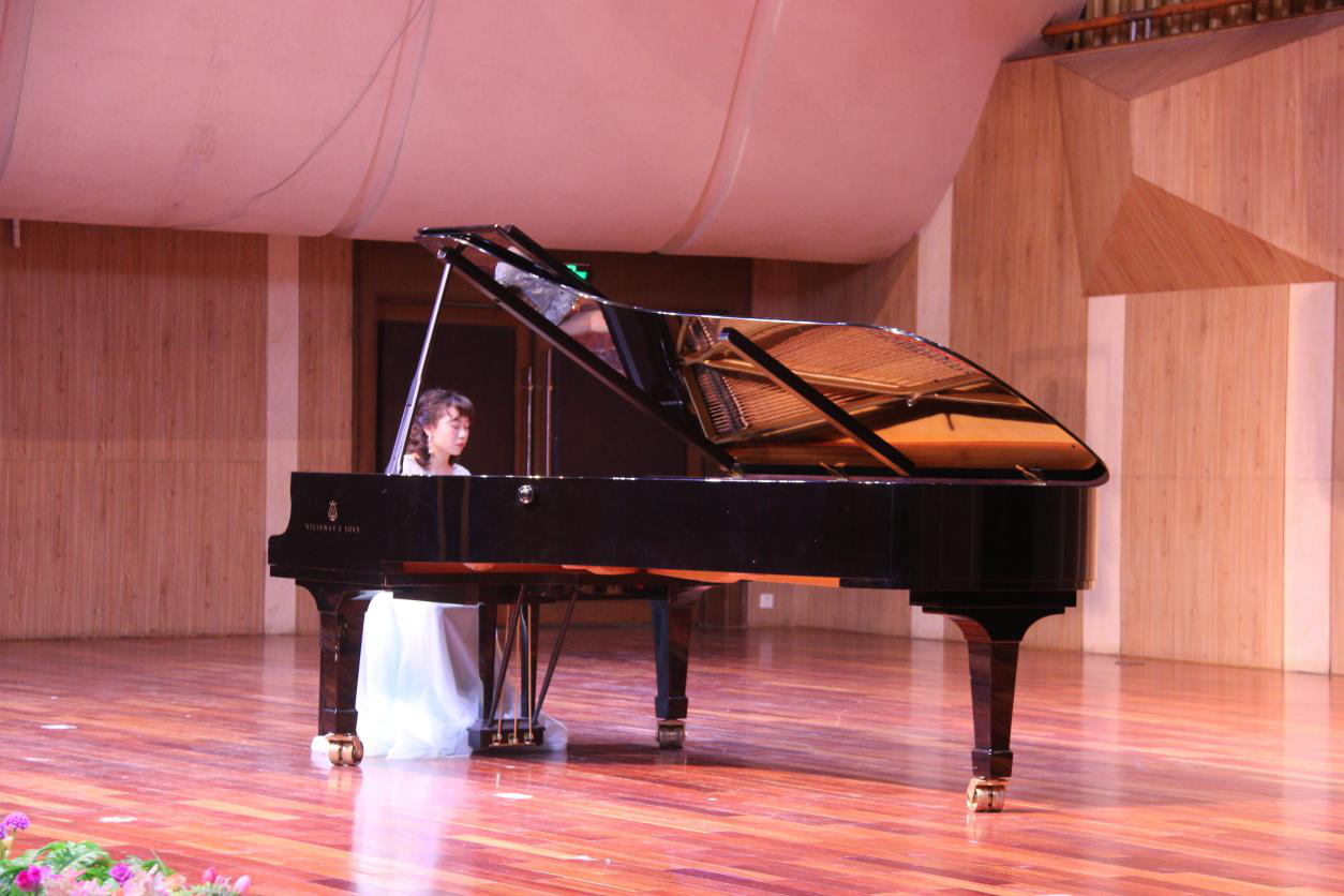 2014级音乐学钢琴专业学生杨刘怿随之演奏了一曲《春江舟影》。此曲作于1980年,整体发展变化与京腔结构“散-慢-快-较快-慢”有相似之处。通过杨刘怿的连续纵向琶音的演奏,且一再转调的变化,为听众描绘出了一幅洞庭湖畔晨曦时的悠然静谧的画面。