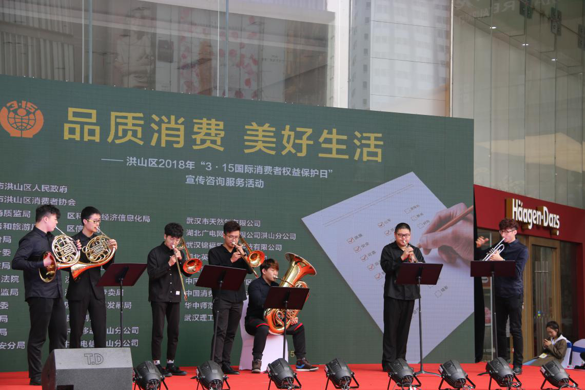 (通讯员:李雅璇)2018年3月15日上午10点,为庆祝消费者维权日,为了更好地宣传消费维权的精神,“3·15”国际消费者权益保护日宣传活动于武汉市洪山区银泰创意城顺利开展。本次活动由武汉市洪山区人民政府和武汉市洪山区消费者协会主办。我校音乐学院部分学子参加了2018年“3·15”国际消费者权益保护日宣传活动,为在场观众带来了一场精彩绝伦的表演。