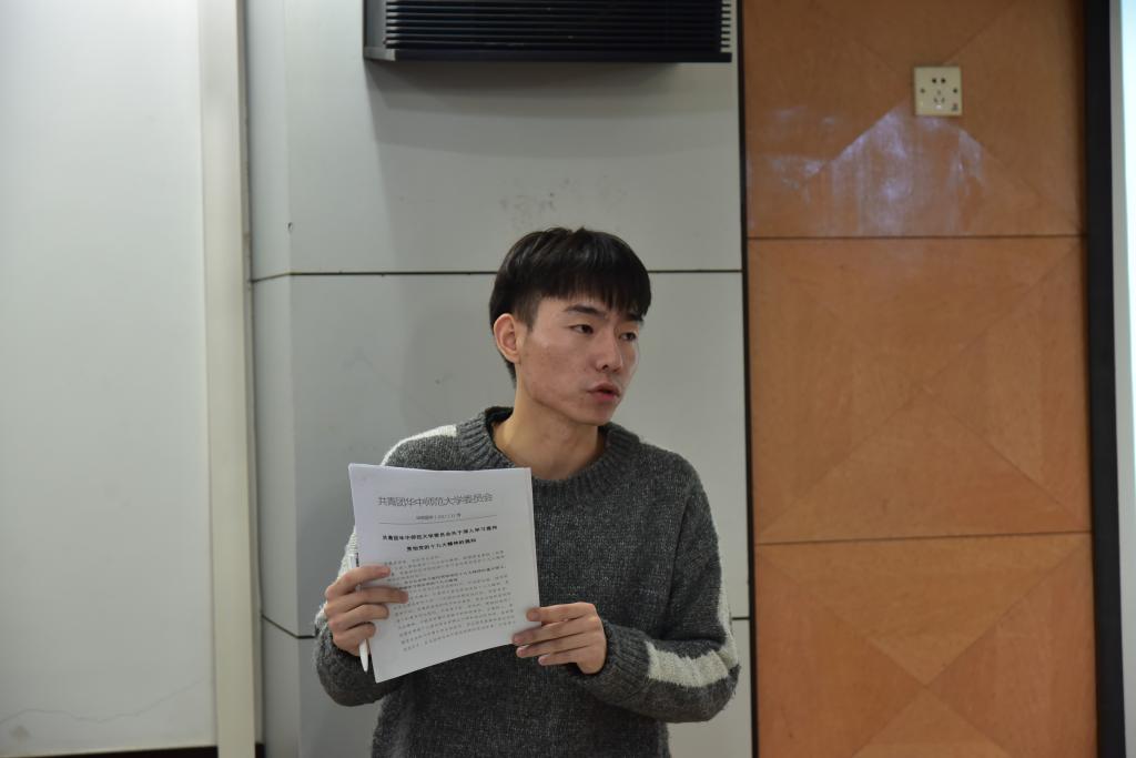 大会一开始,组织部部长张雨晴发言,她结合近期时政热点,学校及团委工作重点她以深入学习十九大会议精神、响应学校号召开展办学思想大讨论、喜迎团代会、团支部活力提升为主题展开讨论,并要求开展一次团日活动和学习十九大精神。