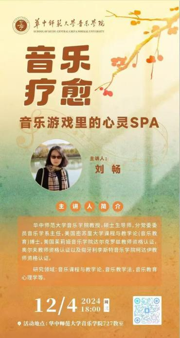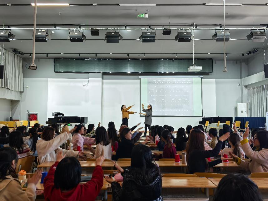 11月28号上午,由我院刘畅教授主讲的《艺心疗愈》课程公开课在学院727教室顺利开课。刘畅老师通过丰富多彩的音乐游戏,带领同学们在音乐中缓解压力、放松心情,寻找内心的宁静与平衡。