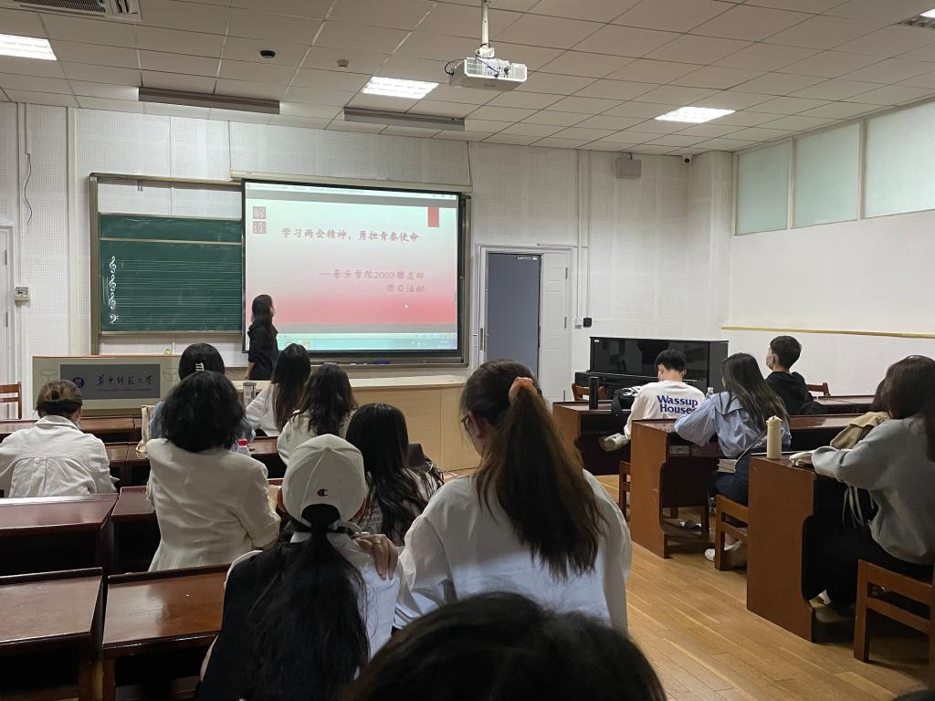 为提高当代大学生的主人翁意识,使同学们更深入地了解国情,解读国家政策、方针,学习宣传和贯彻“两会精神”,进一步明确自身所肩负的历史使命和时代责任,充分认识个人成长与国家富强的密切关系,学院2003团支部积极响应校团委号召,3月13日在学院629教室开展了“学习两会精神,勇担青春使命”主题团日活动,本次活动团支书芮雪主持。