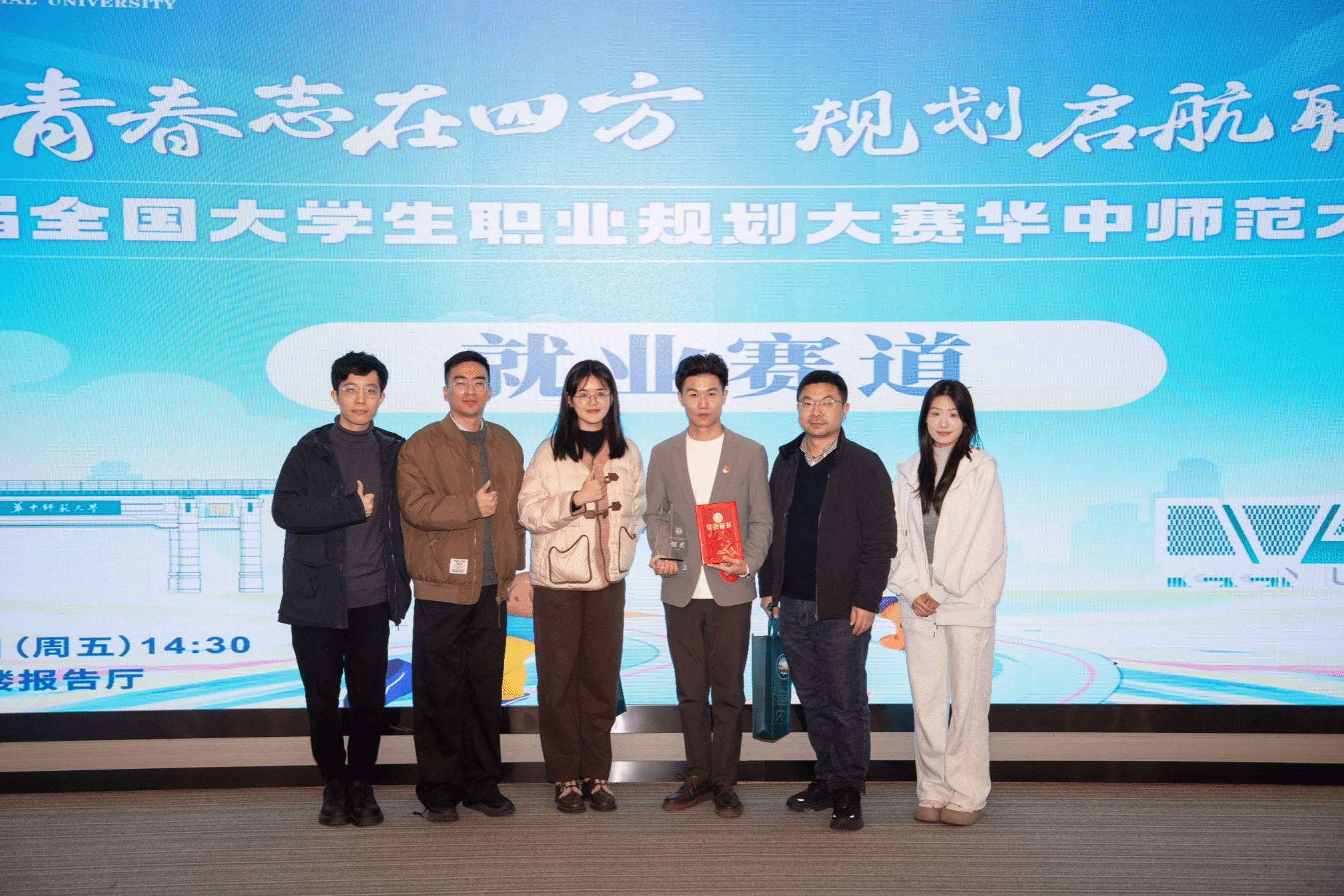 12月8日,第二届全国大学生职业规划大赛华中师范大学校赛结果公布,我院在本次大赛中脱颖而出,获评大赛“优秀组织单位”,并荣获银奖1项,铜奖2项,优秀奖2项的佳绩,我院赵石同学被推荐参加第二届全国大学生职业规划大赛湖北省省赛。