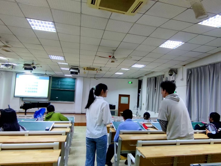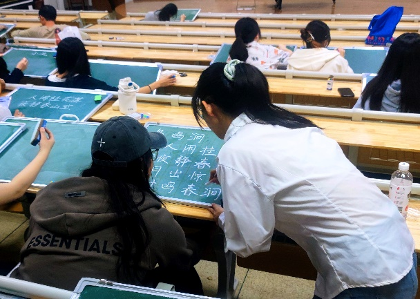 接下来,钟老师和张老师带领同学们进入“粉笔字书法”实践学习环节,两位老师都对同学们的笔顺进行了提问,同学们积极的回答两位老师所提出的问题,并在课堂上进行部分重难点的练习,最后老师让同学们运用王维诗人的《鸟鸣涧》在小黑板上做古诗临慕练习。与学生们进行互动,为学生们指出优点与不足,同学们积极提问并回答老师提出的问题,课堂气氛十分活跃。在两位老师的悉心指导下,同学们逐渐理解本节课教授的书写技巧,并把它亲身实践,写出了较为美观的粉笔字。对此叶秋豫同学表示:“从这些粉笔字作品中,我们可以感受到传统书法,对他们的影响,在他们的粉笔字中,不但能够感受到传统书法的精气神,而且还写出个性,写出了毛笔书法的质感,让人叹服,整体上观察,都是以小楷为范的,而且晋唐韵足,同时,还兼具明清小楷的细腻之感,柔韧之情,很有画面感,也很有质感。无论是老师的粉笔字,还是学生的粉笔字,在用笔上都是十分精准的,也是十分到位的,无论是点画的排布上,还是上下笔之间的照应关系上,都体现出一种精准精致的技艺,和娴熟的技法,同时也让人我们感受到了传统书法的魅力,虽然是粉笔字,但是一样写出了传统书法的精气神,尤其是在线条的打磨上和锤炼上,很见功夫,而且还一种‘笨功夫’,每一个字都入木三分,每一笔,每一划都精准到位,尤其是在他们的粉笔字中,还添加了唐楷的严谨法度,尤其是凸显了欧楷的笔法,很是新颖。”