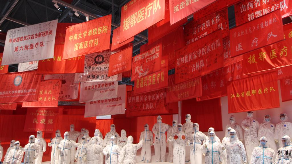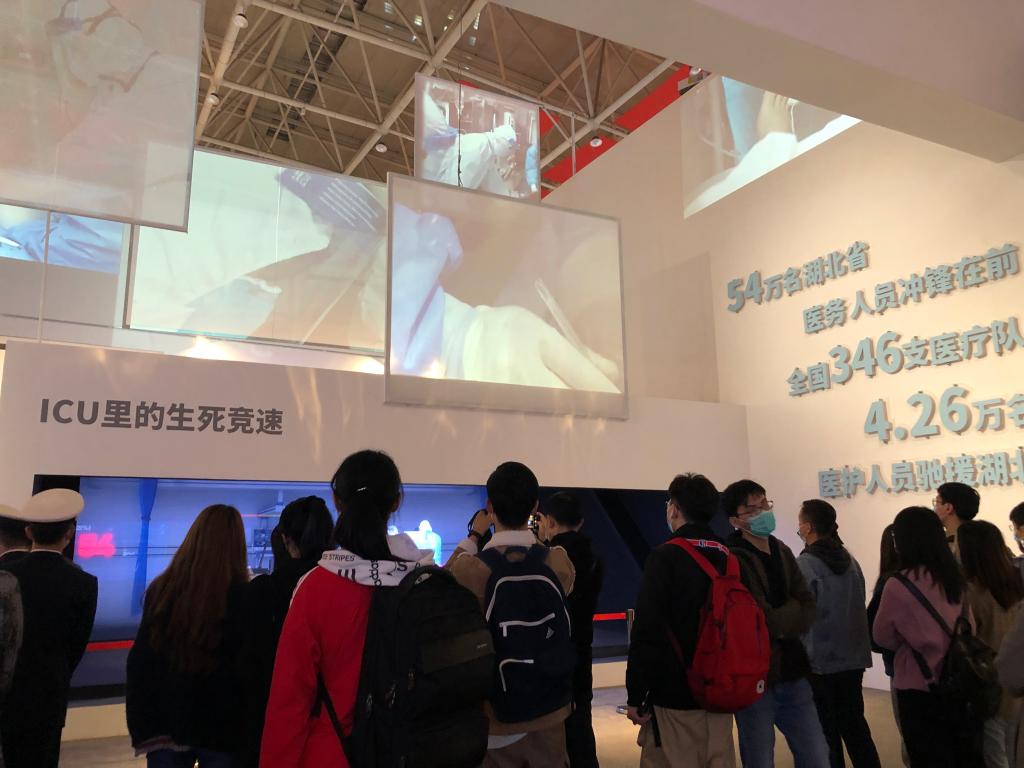 展览上,珍贵的照片、视频、大型场景非常真实地再现了那段惊心动魄、共克时艰的抗疫历程。各地驰援湖北抗疫医疗队队旗展示区十分震撼,写满医疗队队员名字的防护服立在队旗下令人肃然起敬,人民子弟兵出征的蜡像以及烟火气重回武汉路边过早的场景都太真实……这一幕幕让前来观展学习的同学们泪目。