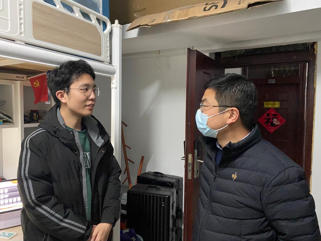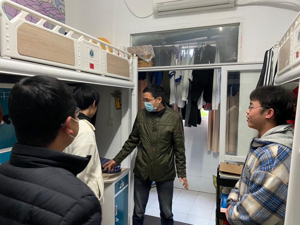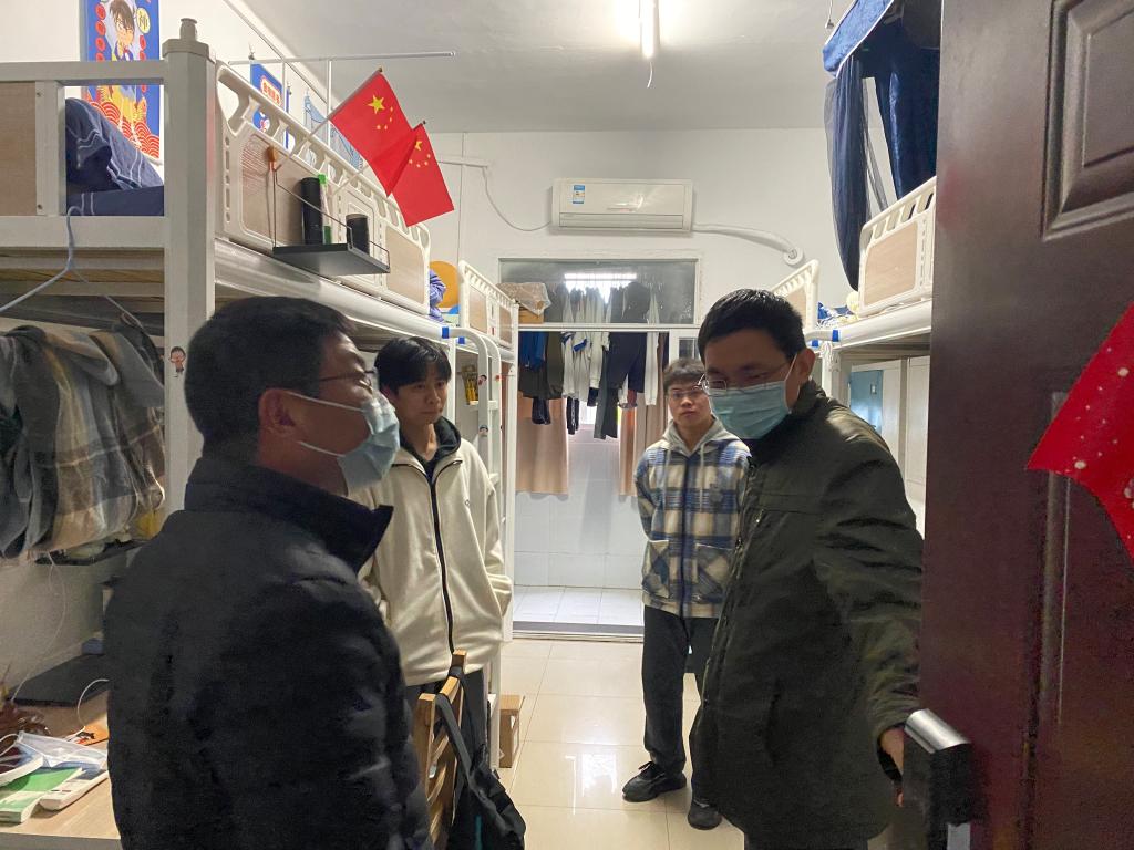 走访同时,冯圣兵等学院领导也重点关注了学生宿舍防疫措施是否到位,宿舍通风是否良好以及卫生是否整洁等问题。提醒同学们要加强疫情防范意识,勤洗手,勤通风,做到及时消毒。年级辅导员郭金栋提醒学生要保持宿舍卫生,及时处理掉外卖盒、快递盒等废弃物品,并在拿取此类物品后注意及时洗手消毒。