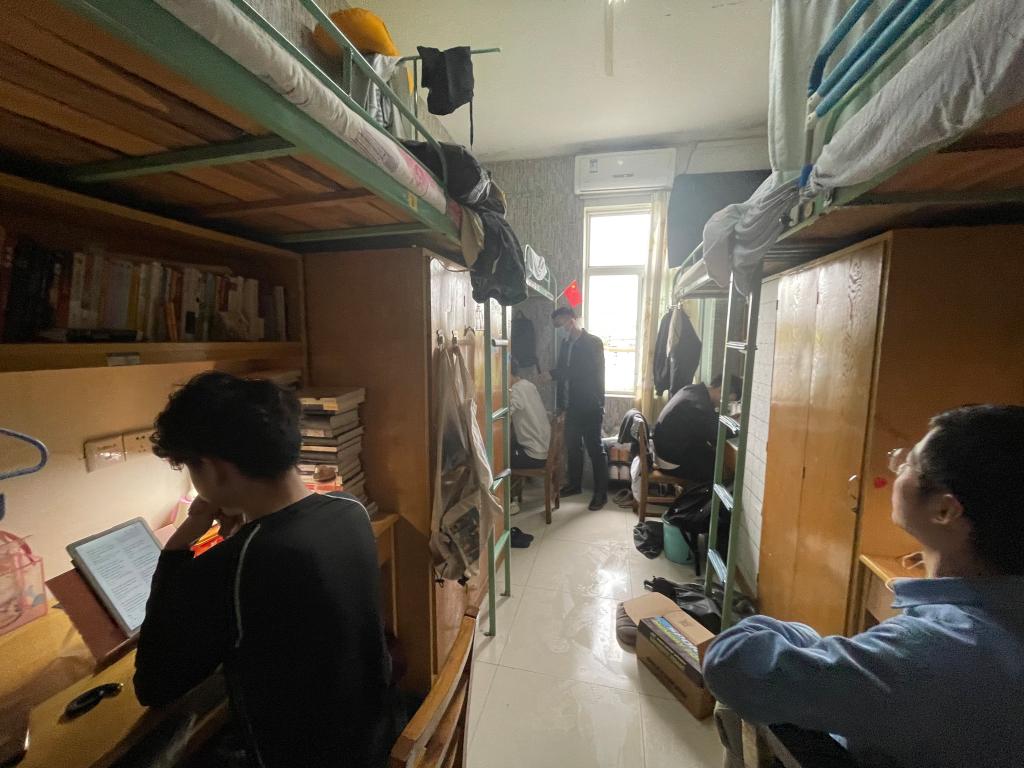 冯圣兵一行人走访了东四宿舍楼。在走访过程中,学院领导亲切询问了同学们的学习及生活情况,并对部分宿舍干净整洁的内务环境以及良好的生活风气给予了高度赞扬。其中,在走访东区四栋男生522宿舍过程中,冯圣兵书记与李雷彪同学进行交流,就宿舍卫生条件、电器使用状况、学生宿舍学习情况以及近期学业状况等与学生进行亲切地沟通交流,并强调用电安全问题。
