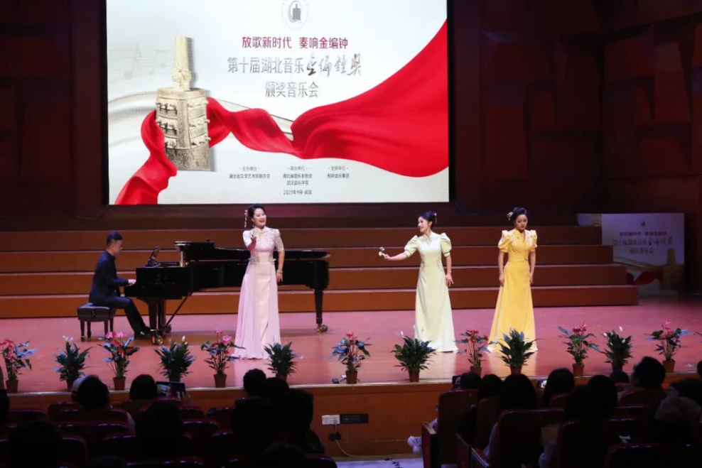 2023年9月24日,由湖北省文联主办,湖北省音协、武汉音乐学院共同承办的“放歌新时代 奏响金编钟——第十届湖北音乐金编钟奖颁奖音乐会”在武汉音乐学院编钟音乐厅隆重举行。本次音乐会万莉老师带领获奖学生黄丽、谭冰演唱创作歌曲《梨花枝》。同时祝贺叶楠辛老师在本届比赛中荣获声乐表演奖(美声组),华中师范大学音乐学院荣获“优秀组织单位奖”。