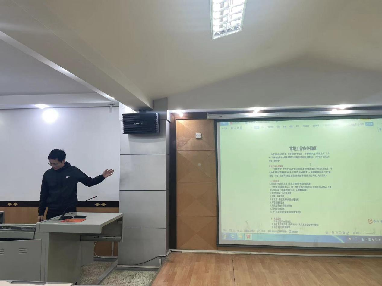 2023年3月29日晚上,研究生2023年春季学期第三次点名于323教室举行,由研究生辅导员陈龚泽祖主持。本次会议内容主要为奖学金评定方法细则汇报、常规工作汇报、其中包括对桂音文艺宣讲团美育活动的宣传、党员发展流程、并对音乐学院学生工作进行总结。最后,再次对师生音乐会、华研之星、辅导员经验分享会三个活动进行动员与宣传,鼓励大家踊跃参与,在华中师范大学的舞台上留下珍贵的回忆。