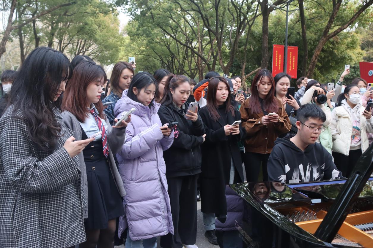 2023年3月27日傍晚,由音乐学院桂音文艺宣讲团主办的专场演奏活动“献给120岁的你”在桂中路顺利开展,吸引了众多师生驻足欣赏。在此次活动中,音乐学院学生们接力演奏,并伴以歌唱和舞蹈,以这种特别的方式迎接120周年校庆。学生们接力演奏,指尖在黑白琴键上跃动,以深情演奏“献给120岁的你”。夜色悄悄降临,而现场围观的师生们久久不愿离去,不少人自发加入,带来即兴演奏,共同为120周年校庆送上真挚祝福。