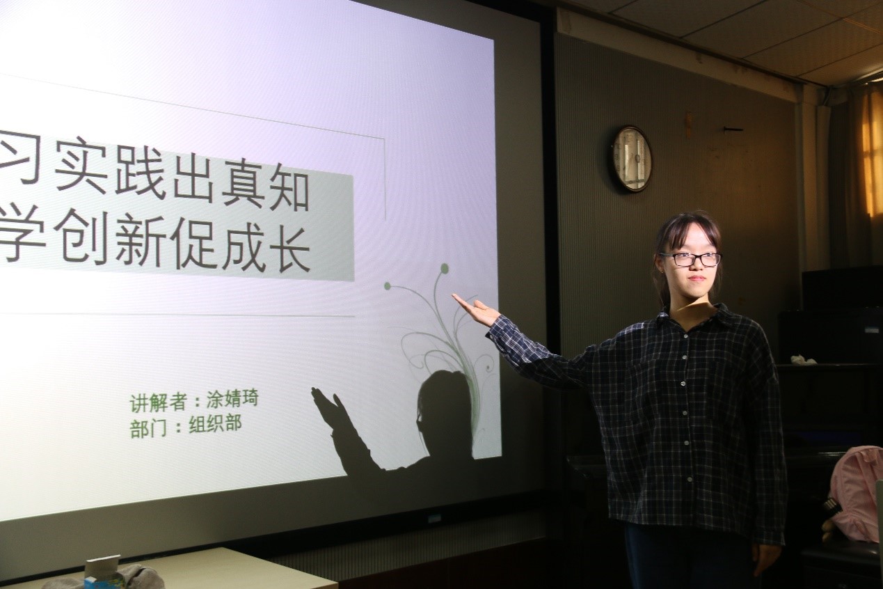 接着,涂婧琦用“不闻不若闻之,闻之不若见之,见之不若知之,知之不若行之。学至于行止矣。”向同学们强调了“学习实践出真知”的重要性,并用司马迁、竺可桢等中外名人的实例加以佐证。“创新”是如今各行各业所提倡的,作为一个新青年、新团员也要紧跟时代步伐,利用自己知识去创造价值。涂婧琦用生动有趣的讲解赢得了同学们专注的目光。