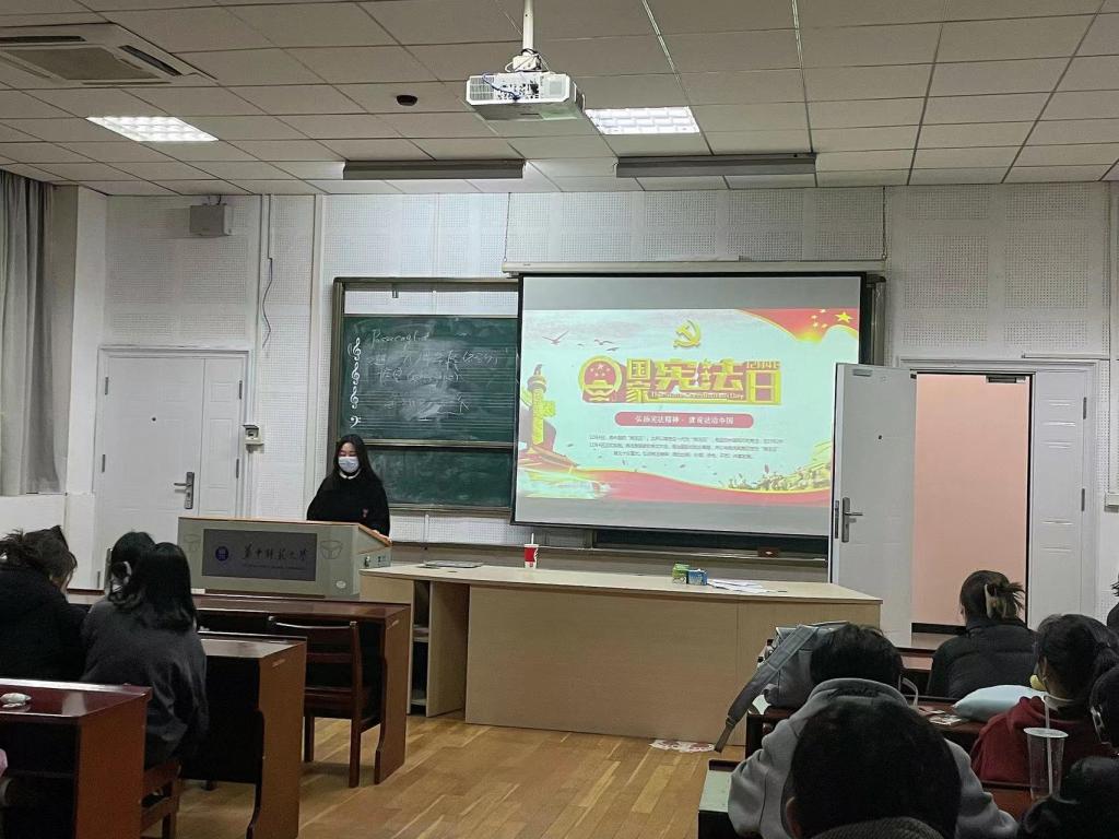 音乐学院2021级2104团支部于12月8日晚在629教室开展了“12.4国家宪法日”主题团日活动。本次活动通过PPT、微电影以及讲解的形式让同学们感受到团日活动的意义 ,有利于营造尊法、学法、守法、用法的氛围,弘扬爱国主义,唤醒同学们的时代使命。