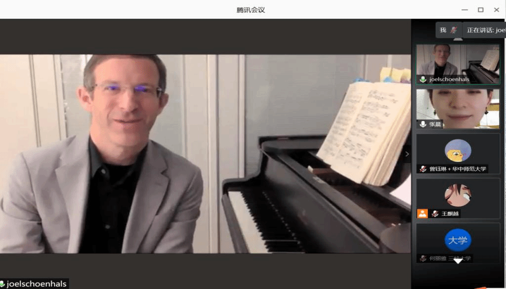 2020.11.16.晚7:00,美国东密歇根大学音乐学院钢琴系教授,华中师范大学音乐学院外聘专家乔尔·肖恩哈斯,以线上方式,为院内、院外约百名师生带来一场关于《贝多芬中晚期钢琴奏鸣曲的教学》讲座,本场讲座是学院国际交流举办Joel教授四场系列讲座的第一场。Joel教授是我们华师的外聘专家,也是斯坦威钢琴艺术家,出版发行过多张钢琴演奏专辑,其演奏的舒伯特等浪漫与现代钢琴音乐具有热情、激情和闪光等特点。