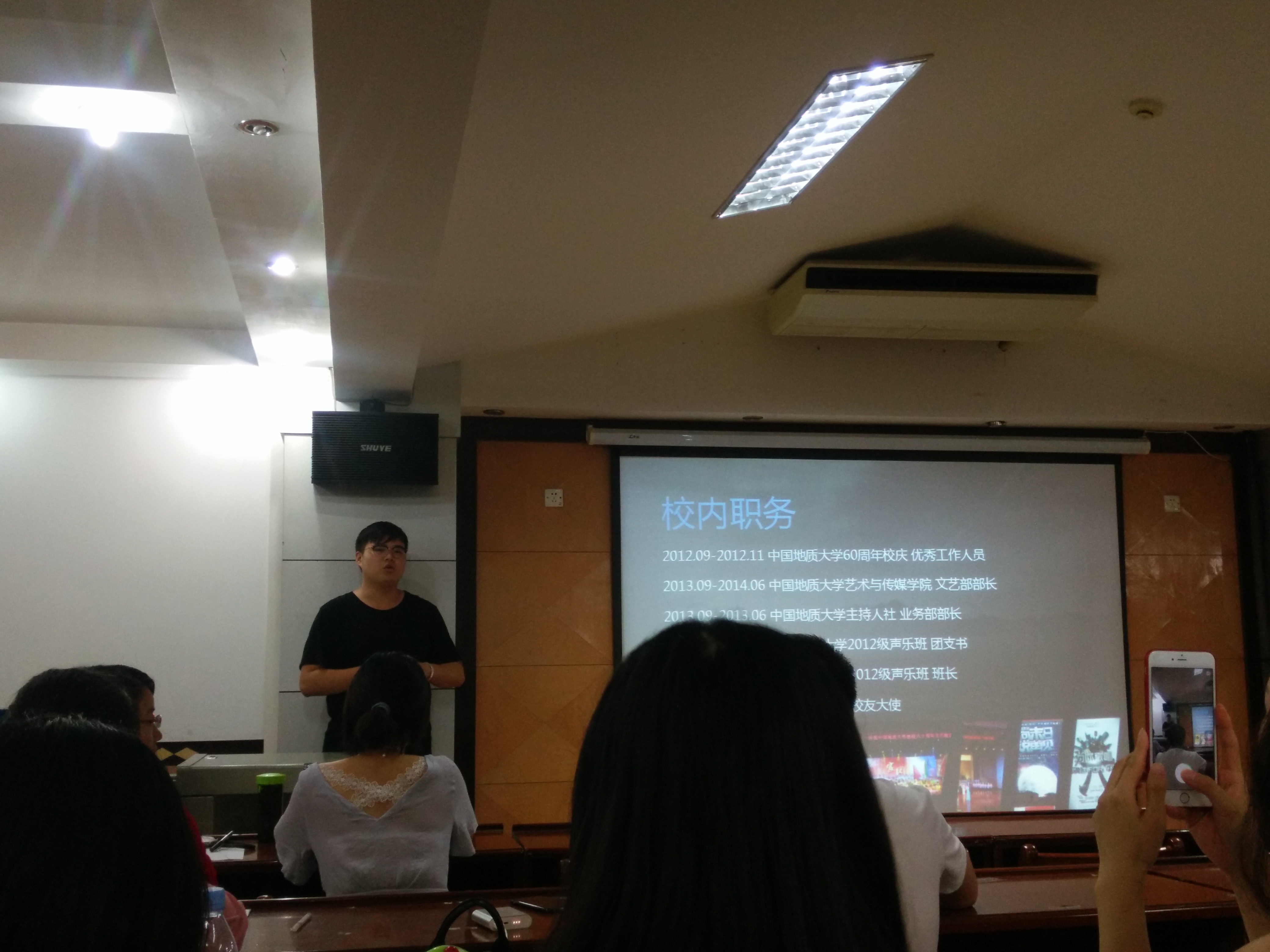 随后,2015级研会主席、辅导员助管曹佳敏同学向全体参与人员分享了自己的工作经历与经验,给同学们提供了不同的选择与视角。另外,曹佳敏同学还详细地介绍了各个学生会部门以及各部门所需的要求与管辖的事物,让参与竞选的同学对各部门有了更为深入的了解。最后,曹佳敏同学提到,所有参与人员需要慎重选择各部门的学生会成员,一旦选定,就请大家全力支持新一届的学生会工作。