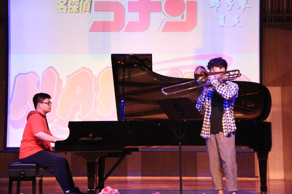 邓子攀,夏炎,曹盛带来的名侦探柯南的主题曲和火影忍者的插曲一下把观众们拉进动漫的世界。方俊杰和舞伴热情奔放的拉丁舞之后是秦涵欢同学深情的独唱《可爱的一朵玫瑰花》则形成了鲜明的对比。吴蒙杰同学激荡的手风琴独奏、邓子攀同学原创作品《桂子》,李任翔和吴蒙杰的合奏《遗忘》一并让观众们陷入青春的追忆中。