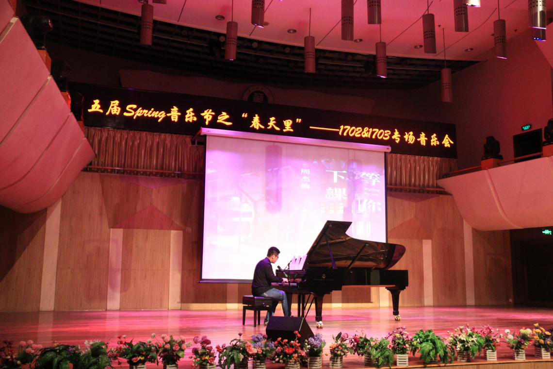 音乐会的开场,1702班全体同学带来了合唱《You raise me up》,多声部的旋律在音乐厅里回响,给观众带来了丰富的视听感受。紧接着,由1702班夏奥同学自弹自唱的一首《等你下课》唤醒了观众们学生时代的回忆,获得在场观众好评。
