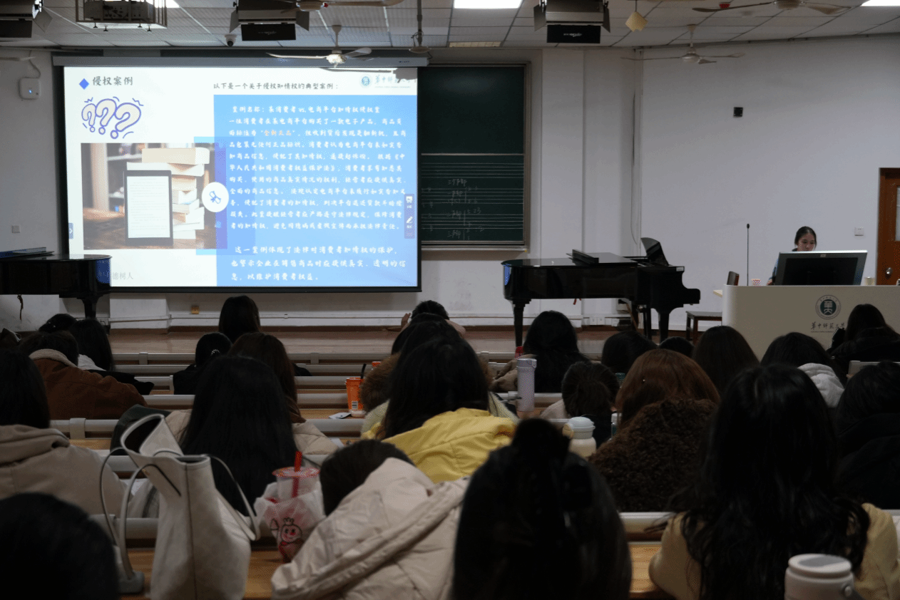 主题宣讲树新风。主讲人结合《消费者权益保护法》修订要点,系统阐释了“七日无理由退货”“举证责任倒置”等条款的法律内涵。通过剖析直播带货虚假宣传、AI技术滥用等新型侵权案例,呼吁同学们“以法治思维筑牢维权防线,以理性实践推动消费公平”,增强维权意识。