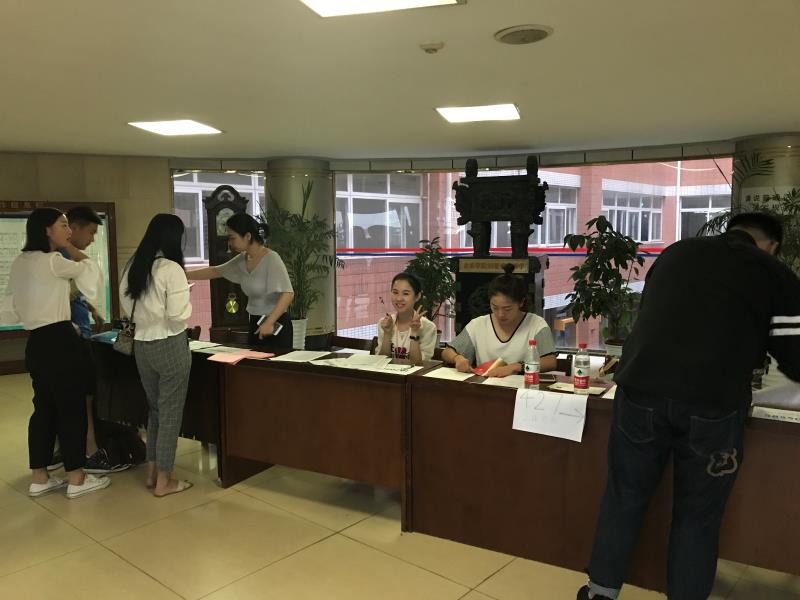 此次迎新工作分为上午和下午两场。负责上午场的成员有:曹佳敏、陈曦紫、喻晗、甘沛泉、尚晓丹。负责下午场的成员有:周小艺、郑昭玥、石坤华。上午8:30分,迎新工作正式拉开了序幕,成员们已经各就各位,以良好的精神风貌为每一位新生与家长提供最热情的服务与帮助。他们引导着新生们有序地进行签到、录取通知书核对、领取校园卡等资料、添加QQ群等项目。在此次迎新工作中,迎新志愿者们各司其职,认真负责,本着为新生服务的原则,提供最贴心的服务。新生们报到结束后,都被院门口的迎新宣传板所吸引,他们也都在上面签下自己的名字并合影留念,作为新起点的纪念。