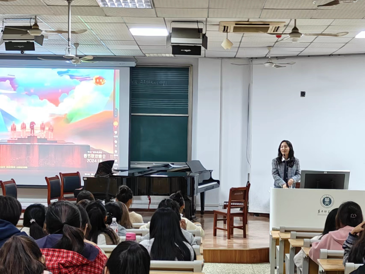 大会第三项,音乐学院教学秘书处学生助理、2022级本科生曾子珊向24级新生介绍学校选课的相关事宜。她首先提出要根据人才培养方案中的内容进行课程的选择,选课应遵循个人兴趣与学业条件,保证学习质量。其次讲解了选课的流程、课程搜索的技巧和课程筛选的原则。她强调,新生应密切关注学院的选课通知和安排,确保在规定时间内完成选课,避免因操作不当而错过选课机会。同时,还要注意课程的学分要求,确保所选课程能够满足毕业要求。