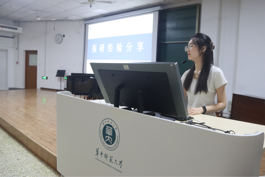 随后,24级研究生王婉婷进行了保研分享。她首先解读了保研政策和条件,并强调了学业成绩在保研中的重要性。紧接着,她详细介绍了推免流程,并分享了自己在保研过程中的经验和心得,建议新生们要制定合理的学习计划和生活规划,明确自己的目标和方向。最后,她以“心有所想,何惧路长”作为结语,鼓励新生们要勇敢追求自己的梦想,不畏困难,勇往直前。