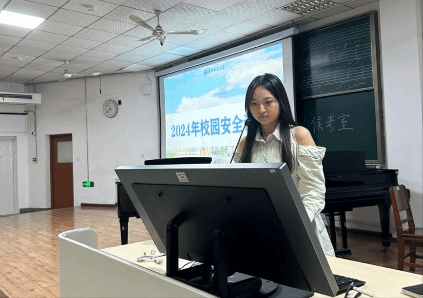 大会第一项,院学生会权益服务中心副负责人钟婉仪进行校园安全讲座。内容包括图书馆使用说明、校车路线及运营时间介绍、电动车使用安全、寝室电费缴纳、失物招领及预防策略、食堂介绍及权益维护等多个方面。