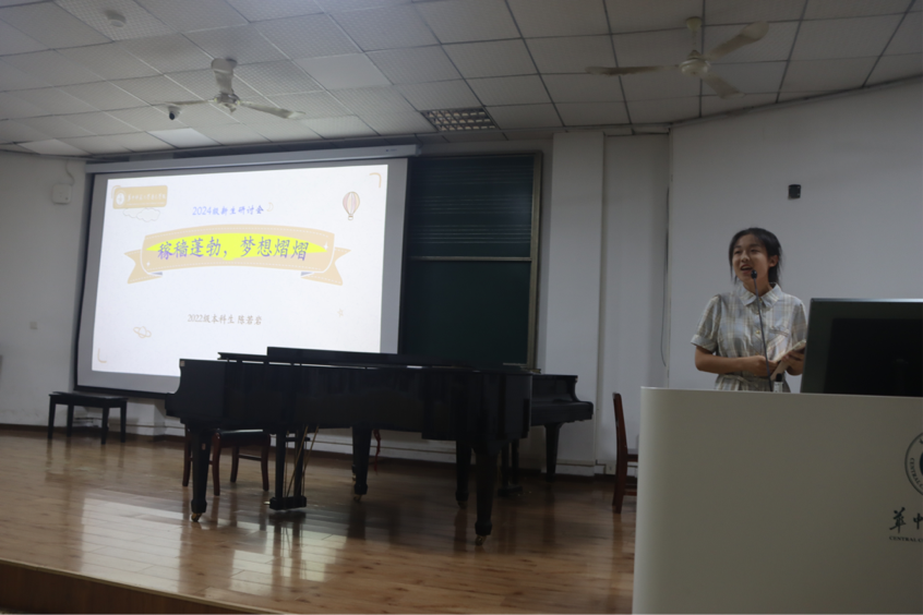接着,22级本科生陈若岩以“稼穑蓬勃,梦想熠熠”为主题分享了自己的一些学习心得。她强调要将化被动为主动、选择的多样性以及化他律为自律的重要性。同时,陈若岩还分享了调整情绪的小贴士和时间管理的技巧,帮助新生们更好地适应大学生活。此外,23级本科生蔡新怡也在分享会上发言。她重点讲述了学业成绩的重要性,并分享了自己在学习和社会实践活动中的经验。她鼓励新生们要明确自己的目标和要求,积极创造良好的学习环境,努力提升自己的学业成绩。