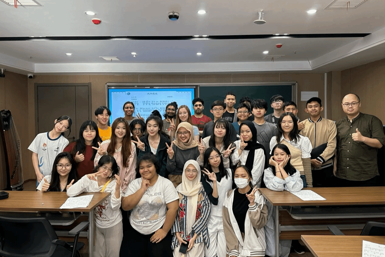 课程尾声,余月涵开设“古筝初体验”工作坊,指导学生佩戴义甲,尝试指导弹奏《茉莉花》片段,几位学过古筝的国际学生更是自信地展示技艺,进一步激发了大家的参与热情。