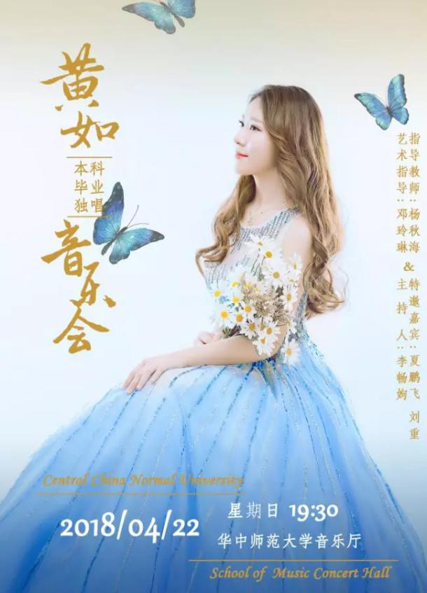 黄如,主修声乐和二胡。多次获得“国家奖学金”、“校三好学生”、“优秀共青团员”等众多荣誉。她曾获得过第十六届全国大学生英语竞赛特等奖、英语演讲比赛三等奖的好成绩以及各类器乐、声乐大赛的大奖。与此同时,黄如辅修了外国语言文学,还担任过班长和学院团委学生会的组织部部长,也是“Tiankong”合唱团和华中师范大学“博雅计划”的成员。