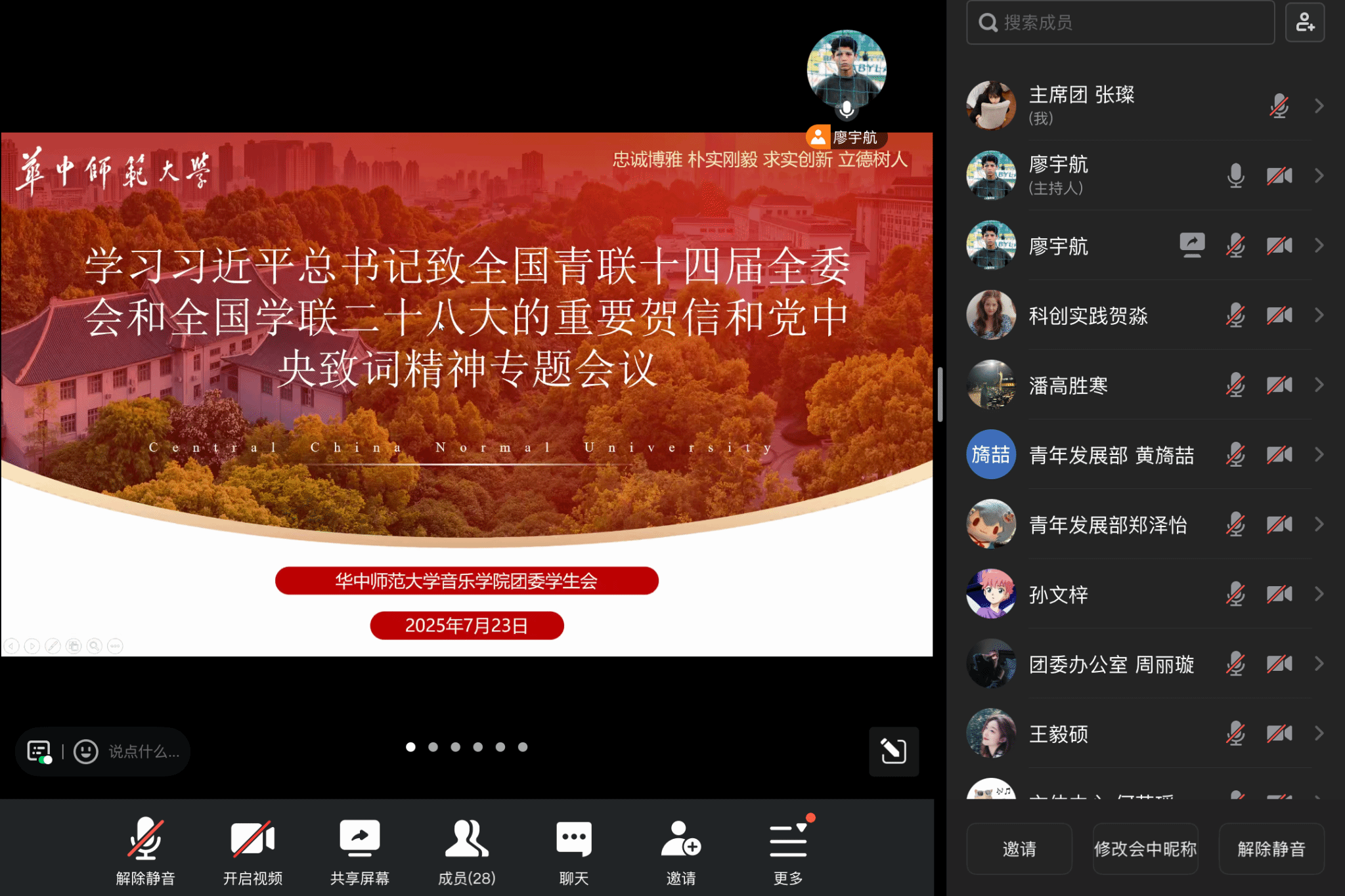 中华全国青年联合会第十四届委员会全体会议、中华全国学生联合会第二十八次代表大会于7月2日上午在北京开幕。中共中央总书记、国家主席、中央军委主席习近平总书记发来贺信,代表党中央表示祝贺,向全国各族各界青年和青年学生、向广大海外中华青年致以问候。7月23日,华中师范大学音乐学院团委学生会召开专题会议学习习近平总书记重要贺信和党中央致词精神。会议由学生会主席团成员廖宇航主持。