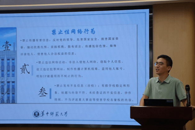 9月17日,我院面向全体硕士研究生组织召开了《华中师范大学学生网络文明行为规范(试行)》专题解读会,由研究生辅导员郭康源主讲,围绕规范中的重点条文展开解读,结合典型案例剖析,详细阐述了学生在网络空间中享有的权利与应尽的义务。