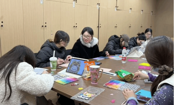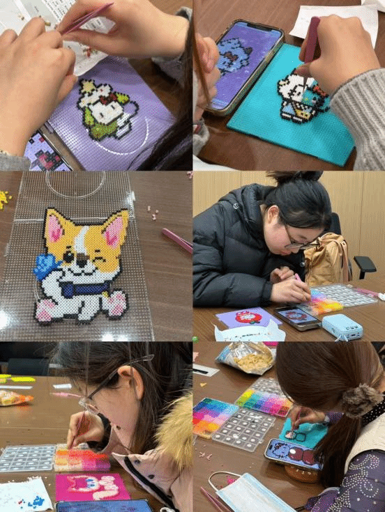 近5小时的自由创作环节中,参与者们全神贯注地投入到拼豆艺术创作中。在彩色豆粒、指尖与镊子的配合下,逐渐形成精美图案。有同学在过程中说起:“这种重复的排列过程非常治愈,让我从论文写作的压力中暂时解脱出来。”