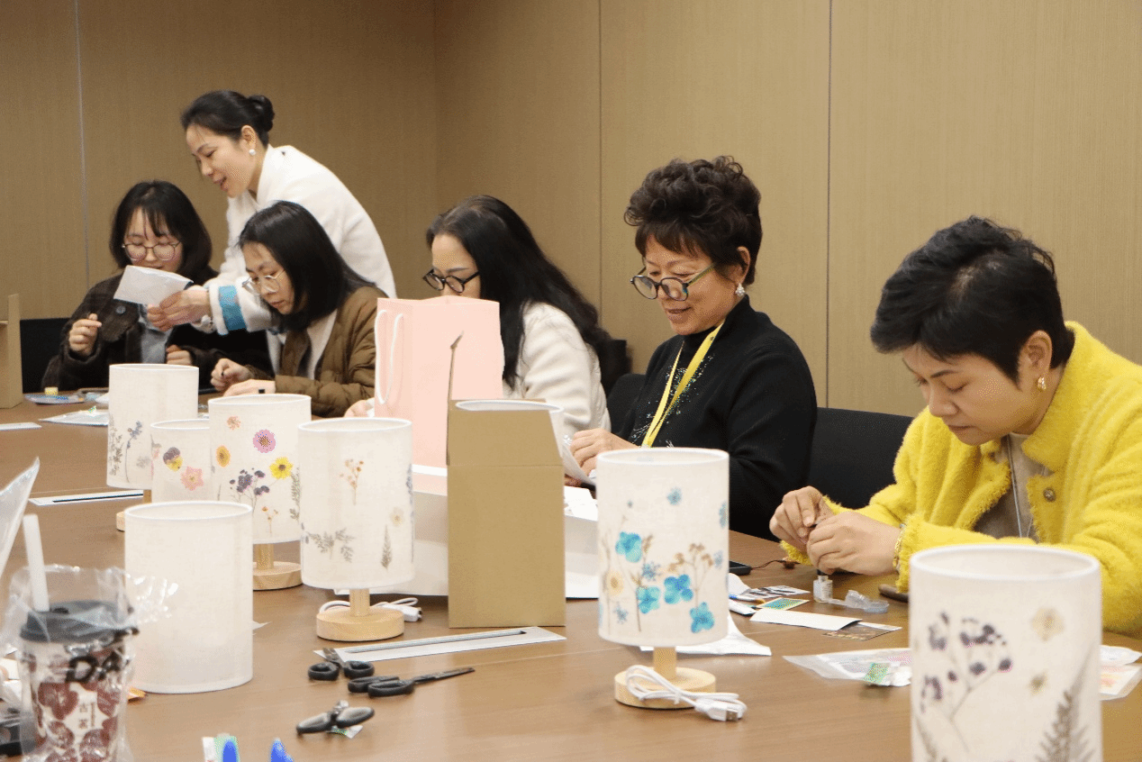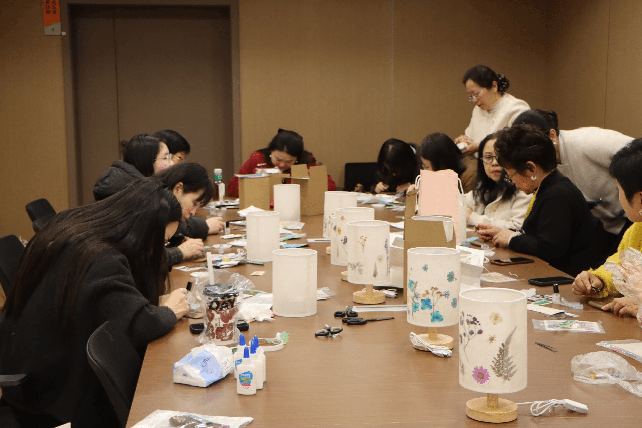活动现场暖意融融,氛围热烈。在老师的细致讲解和示范下,大家兴致勃勃地投入到创作之中。花草灯制作区域,老师们精心挑选干花、枝叶,巧妙地构思布局,将自然之美定格于灯罩之上,一盏盏独具匠心的花草灯逐渐成型,点亮后更显光影交错,诗意盎然。在螺钿梳子制作区,大家则展现出极大的耐心与细致,将一片片色彩斑斓的螺钿片精心打磨、镶嵌,在指尖的轻抚下,一把把普通的梳子焕发出温润而典雅的光泽,承载着大家对美好生活的期许,对传统文化的敬意,也彰显了新时代女性优雅、坚韧、创新的巾帼风采。