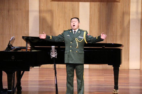 其中一位穿着军绿色的军服,挺拔的站姿,昂首挺胸映入我们的眼帘,肖宗明演唱此曲,随着《我的爱人你可听见》的伴奏音落下,悠扬的旋律在跳动,让观众深深感受到作曲者为纪念中国工农红军长征胜利80周年发生的感染事件,凸显工农红军百折不饶、团结互助、不怕牺牲、不畏艰险的长征精神。