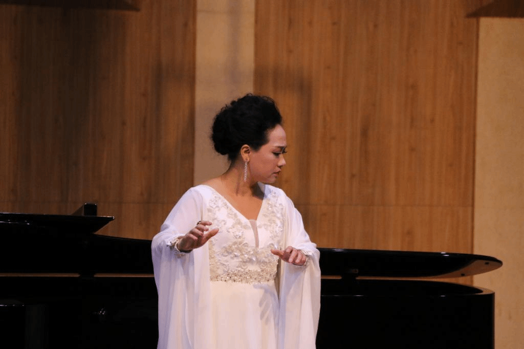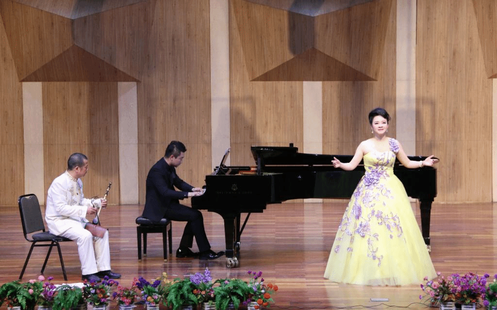 第三位上场的蒋文娟,抒情花腔女高音,现任教于长江职业学院音乐传媒学院。作为一位湘妹子,是本场音乐会唯一一位在民族声乐表演艺术之树上开花结果的青年歌者,也是彭小玲教授积极探索民族声乐教育所奉献的一枚硕果。蒋文娟扎根于中国民族民间音乐的沃土,学习钻研各地民歌小调、戏曲,同时借鉴美声唱法的精髓。本场音乐会上蒋文娟演唱的东北民歌《今年梅花开》运用高难度的花腔技巧,展现了浓郁的地方风格。尤其是蒋文娟演唱的《卜算子·咏梅》(孙玄龄曲),特邀京胡演奏家共同演绎这首作品,京腔京韵,充分表现了中国民族艺术的美。